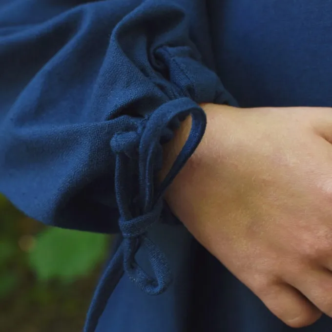 Kjoler som denne blev båret i middelalderen som en underkjole i de koldere måneder, eller som en almindelig kjole i sommeren. Ærmerne og hals har ledninger til at justere kjolen til din størrelse. Med disse ledninger, kan du også oprette en lys pustede ærme effekt. Du kan bære kjolen separat eller under en anden farve kjole eller kombinere det med et forklæde. For at bestemme størrelse, måle barnets krop højde. Med en legemshøjde på 128 cm, størrelse 128 er den bedste løsning.