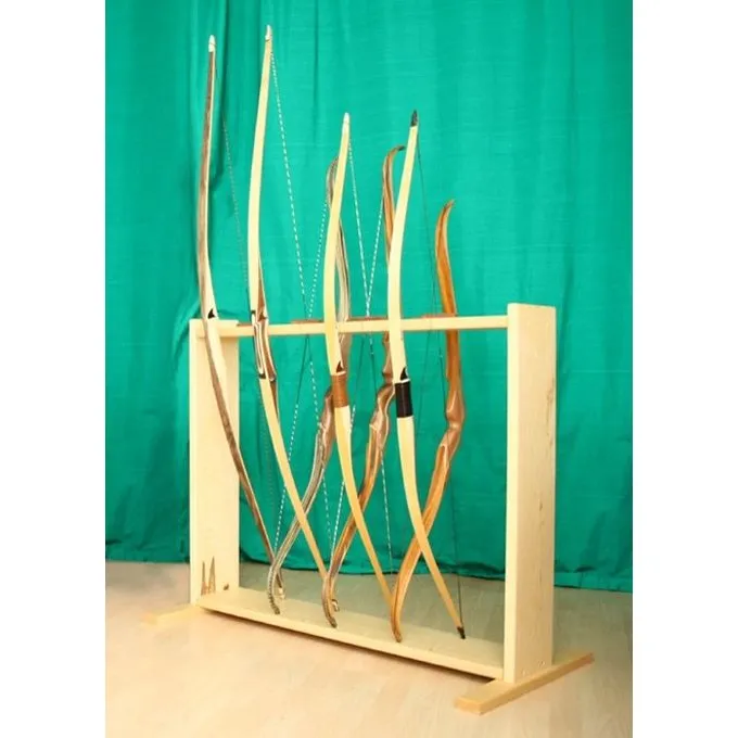 Denne solide bue stativ er velegnet til visning af 8 buer. Det kan tages af og kan meget nemt sættes sammen igen. Meget praktisk til bueskydning konkurrencer og re-enactment. Denne håndgjort bevoksning er lavet af fyrretræ.