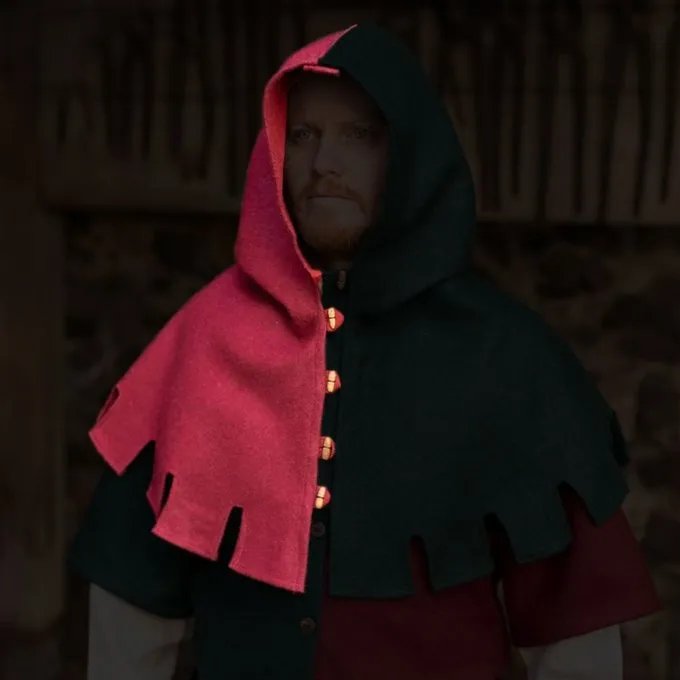 Oplev den nye MI Parti -samling fra Burgschneider! Chaperon Dangerneuse består af to halvdele, der sælges separat. På denne måde kan du sammensætte en Mi Parti -hætte til dine ønsker. Fastgør venstre side til højre side med knapperne. Hvis du er i forskellige middelalderlige larp- og genindførelsesgrupper, kan du lave en masse forskellige farvekombinationer med et par venstre og højre side. Hætten er et tøj, der blev båret i det middelalderlige Europa mellem det 12. og 14. århundrede. Oprindeligt bar landmændene hovedsageligt det mod kulden og regnen, men senere blev det et modestykke, og det påtog sig specielle former. Chaperon “Dangereuse” er lavet af et tungt uldstof med en dyb farve, der er egnet til alle vejrforhold. Fra det 11. til det 16. århundrede var “Mi-Parti” (delvist farvet) kjolestil populær og forbinder to forskellige farvede stoffer i midten. Effekten er en farvekontrast, der ofte skaber et dramatisk look. I middelalderen var Mi-Parti en vigtig stil blandt kappe, tabeller, kjoler, bukser og kjoler. De tidligste eksempler på denne stil går tilbage til det 9. og 10. århundrede, hvor de splittede farver blev brugt på ben og sko. For eksempel var støvlerne en halv farve og halvdelen af den anden farve. I den høje middelalder voksede MI Parti -stilen i popularitet, da farvesymbolik i tøj blev vigtigere. Farverne stod ofte for en bestemt status eller en bestemt forbindelse. Stilen blev mere almindelig i det 13. og 14. århundrede, da mange mænd, især vasaler, efterlignede våbenskjoldet fra deres feudale herrer. Mot slutningen af det 16. århundrede faldt stilen gradvist.