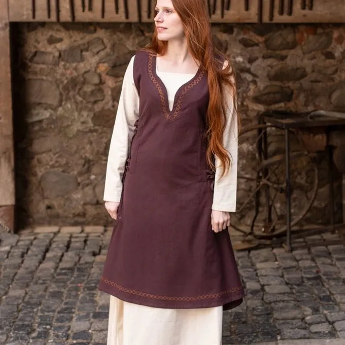Dette overdresser kan bæres over en enkel endda klæde til at skabe et specielt look. Den har en bemærkelsesværdig udskæring og en broderet symmetrisk mønster rundt om halsen og forneden af skørtet. På siderne af kjolen er snorker at stramme det for en tætsiddende model. Et perfekt supplement til en LARP, Cosplay eller festival outfit.