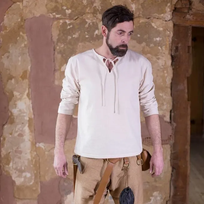 Shirts som disse blev båret i middelalderen i alle klasser af samfundet, fra ridder til bonde. Det har to stof snorer til at binde halsudskæring. Ærmerne har ikke snorer eller Knapper, så skjorten kan mageligt bæres under en slagkofte / brynjefrakke. På kolde dage skjorten kan bæres under en uld tunika eller skjorte for ekstra varme