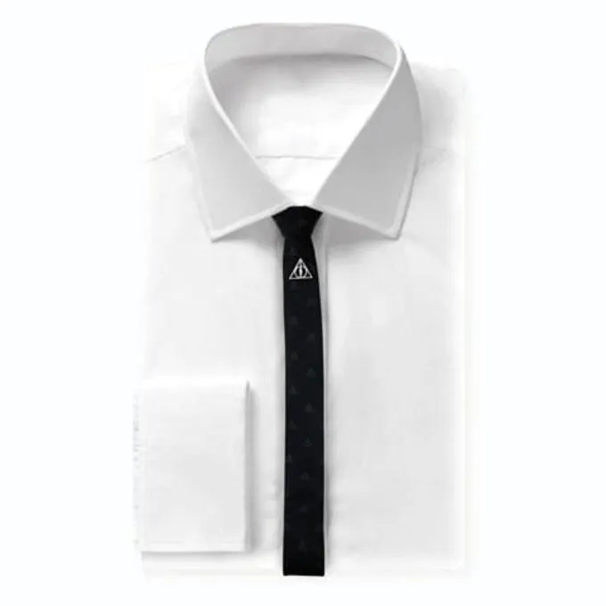 Perfekt til en Harry Potter cosplay -kostume! Dette slips er en officiel filmreplik af de bånd, som Hogwarts -studerende bærer i Harry Potter -filmene. Kombiner det med en af vores Harry Potter -klæder og Hogwarts -studerende trøjer til et komplet cosplay. Hvis du har brug for et slips til en særlig lejlighed, er dette slips også sjovere end standarddesignene. Dette slips er lavet med symbolet Deathly Hallows, kommer i en Deluxe -gaveæske og leveres med en pin i form af Symbolet om dødbringende Hallows.