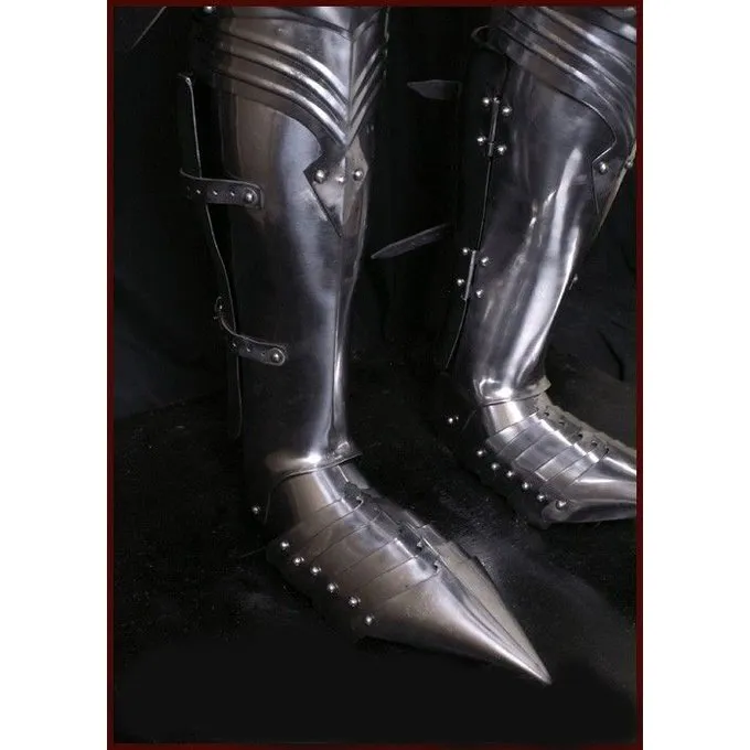 Det har rundinger bag på knæene for at sikre, at også disse åbne pletter er beskyttet. Rustningen er helt bærbar og er lavet af 1,2 mm tykt stål. Den vejer 37,8 kg og længden er 1,80 m.