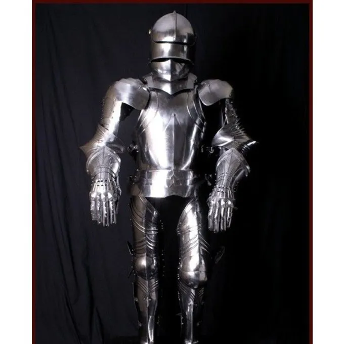Denne gotiske rustning fra det 15. århundrede består af en lukket sallet, bevor, cuirass (tysk stil), armbånd, albue-betjente (italiensk stil), handsker (tysk stil) komplet benpansel og sabatoner. Rustningen er ribbet, dette var ikke kun en italiensk og tysk modetrend, men det gav også ekstra sikkerhed.