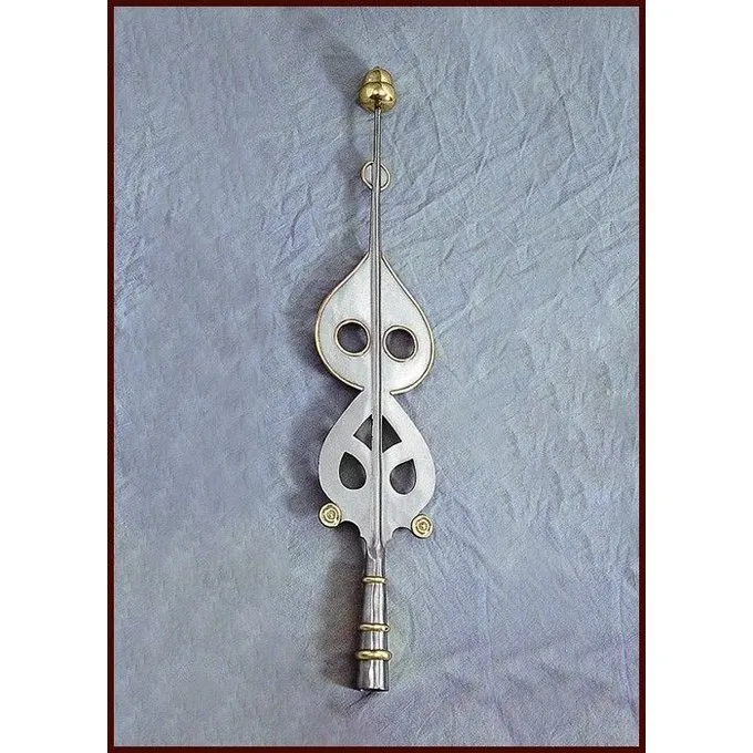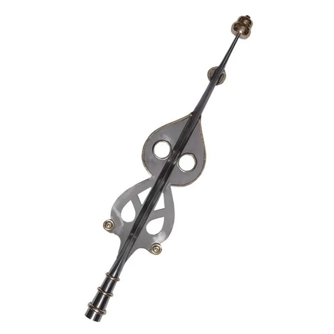 Længden af holderen 92 cm og den største bredde er 29 cm. Det er lavet af stål og er dekoreret med messing motiver.