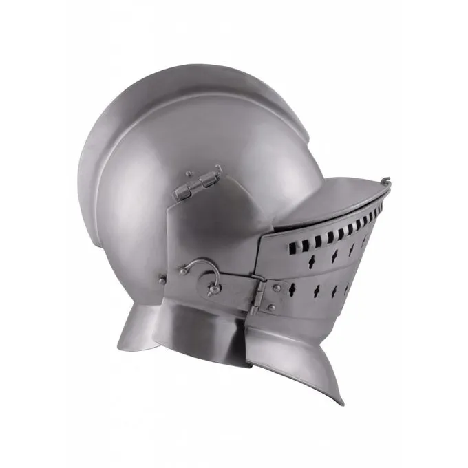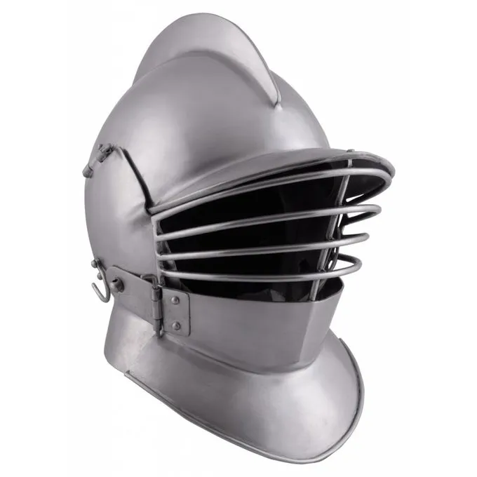 Denne burgunderhjelm er baseret på 16. århundrede originaler. Denne type hjelm blev anvendt indtil langt i det 17. århundrede. Det tilbød optimal beskyttelse kombineret med en god synsfelt og havde store fordele i forhold til sine forgængere. Denne burgunderhjelm har en beskyttelse hals. Den burgunderhjelm kan bæres på tre forskellige måder, alt efter den ønskede beskyttelse og synsfelt. 1. Kun burgunderhjelm (eventuelt med beskyttelse halsen), 2. burgunderhjelm med grill visir, 3. burgunderhjelm med lukket visir. Denne burgunderhjelm er fremstillet af 2 mm tyk stål og er forsynet med en læder articles og en hagerem