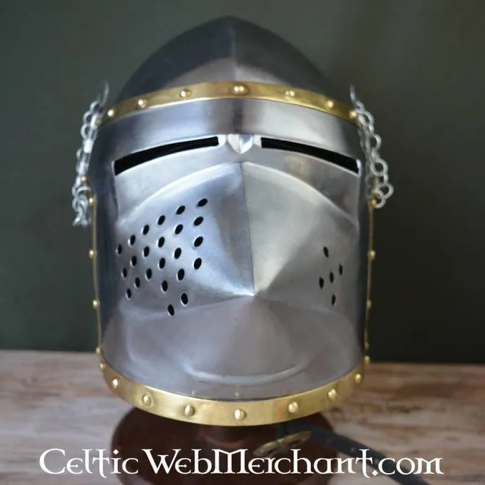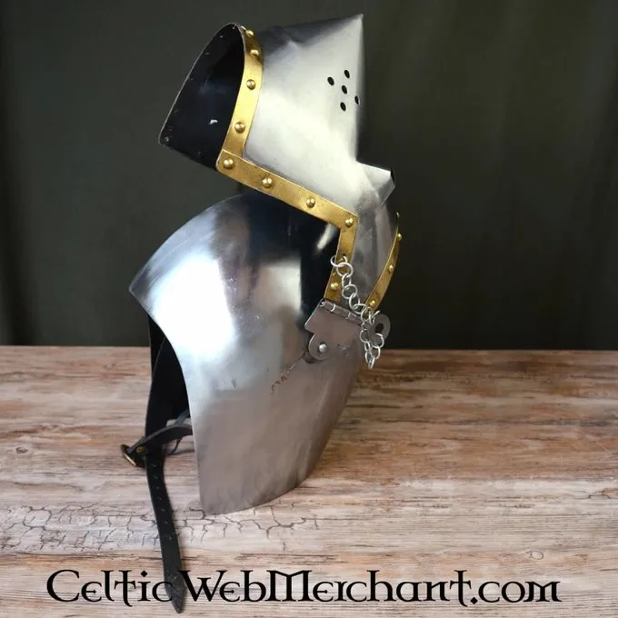 Denne hounskull bascinet har en spids visir til at beskytte ansigtet mod slag. Visiret er forsynet med lufthuller og giver et godt synsfelt. Hjelmen er dekoreret med messing slå ligesom originalen. Hjelmen er velegnet til hoveder med en max. omkreds 61 cm.