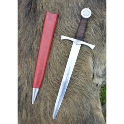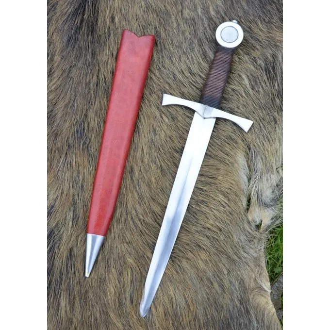 Denne type kort dolk var meget populær i middelalderen, både med riddere, som sekundære våben, og med fælles soldater, pikemen og bueskytter. Denne model blev brugt i det 14. og 15. århundrede. Dolken har en klinge af hærdet fjederstål og er sløv. Den er velegnet til lys sværdkamp. Den dolk leveres inklusive skede. Den røde læder skede dæksel giver det en ekstra luksus udseende.