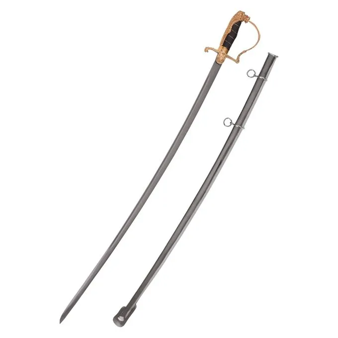 Denne sabel har en skruet pommel. Quillions, knækbue og pommel er lavet af guldfarvet messing. Pelen har formen af et løvehoved, og løven har rødfarvede øjne af indlagt glas. Kvillionerne viser også et løvehoved og forskellige organiske dekorationer i form af blade, kvier og en fugl. Grebet er lavet af træ og er indpakket med sort læder og messingtråd. Sabel leveres inklusive stålstab med båndsløjfer.