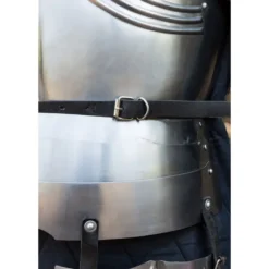 Materiale: læder, stål / Tykkelse: 1,2 mm (18 gauge) / Længde: 61 cm foran, 73 cm på bagsiden / Bryst omkreds: 120-140 cm / Halsåbningen: 18 cm / Tassets: 29 x 23 cm / Vægt: 9 kg / Levering inkluderer: indkapslede, bagplade, tassets / Baseret på en histor