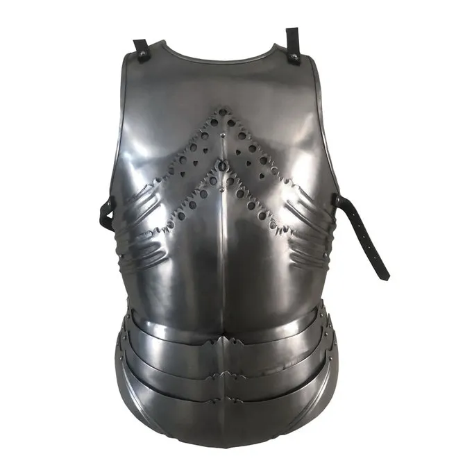 Denne smukke kyrads med matchende bagplade er lavet i den smukke stil af tyske gotiske (15.-16. århundrede). Den rustning er rigt dekoreret med gotiske mønstre, der svarer til dekorationer i manuskripter og parallelle kamme, der styrker stålet og samtidig ser meget elegant. Armeringen er 1,2 mm tyk, så det ikke er egnet til reenactment slag. Du kan bære den som en dragt, under larp kampe eller bruge det som dekoration. Du kan derefter kombinere det som ønsket med en hjelm og ben rustning efter eget valg til at skabe en fuld rustning. Selen består af forskellige plader og er meget fleksibel og let at bære. Du kan justere den til størrelse med læderremme.