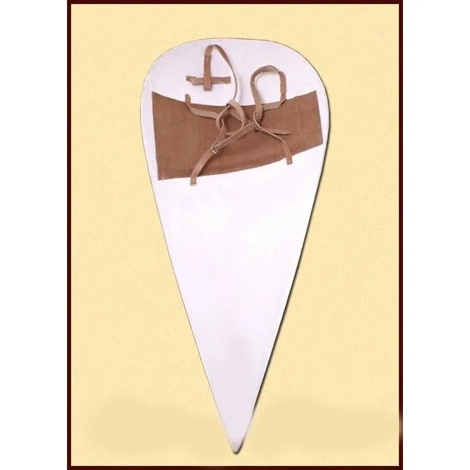 Dette skjold er lavet af 10 mm tykt træ og er dækket med linned. Linned er limet til træ og malet hvide, så det nemt kan males med dine ønskede farver. På bagsiden har den en rem til at bære, arm stropper og polstring. Skjold har en højde på 131 cm, en bredde på 56 cm og vejer ca.. 2,9 kg.