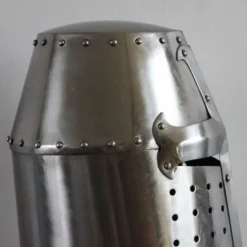 Denne replika er baseret på flere originale hjelme fra det 13. århundrede. Den tøndehjelm eller gryde hjelm blev udviklet omkring det 12. århundrede i den tid af korstogene, og det blev brugt indtil det 14. århundrede af både riddere og tunge europæiske infanterister. I disse århundreder ændret fra et enkelt design med kun smalle slidser til øjne og mund til en afrundet hjelm. Den tøndehjelm forudsat mere beskyttelse end den tidligere Hjelm with næseskinne men det reducerede perifere syn, og det havde begrænset ventilation så generelt det blev sat på lige før kampen. En mindre hjelm, ligesom en rundhjelm af bascinet, blev ofte båret nedenunder tøndehjelm.