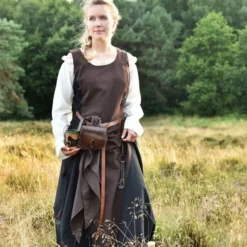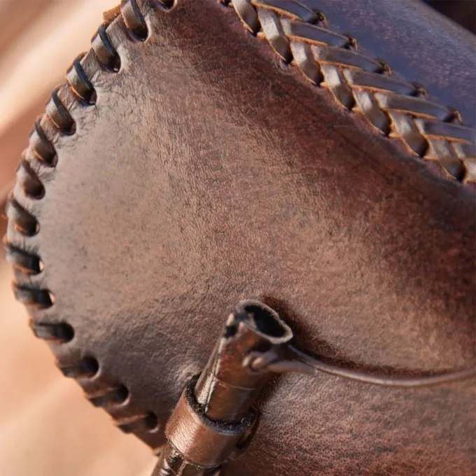 Denne tidløse læderpose er velegnet til kostumer fra den tidlige middelalder til det 19. århundrede. Det er også perfekt til at holde din pung og kontanter under festivaler og komiske ulemper. Denne smukt formede bæltepose lavet af kohud-læder af høj kvalitet har polerede kanter og en let farvefinish, hvilket giver læderet sit karakteristiske anvendte look. Indersiden er lavet af ruskindlæder, og du kan lukke posen med en læderskift.