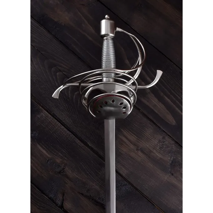 Typisk for Pappenheimer-rapieren er den kurvformede beskyttelse, der beskytter hånden. Denne dekorative rapier har et greb indpakket i ståltråd, afskærmningen er foret med luksuriøs rød fløjl. Det leveres inkl. En træskår dækket med sort læder, skinden har stålkapsler.