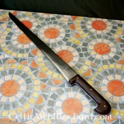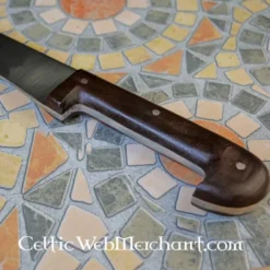 Produkt detaljer: Længde: 54,4 cm / Klingelængde: 41 cm / Grebets Længde: 13,5 cm / Vægt: 550 g / Ståltype: DA45 kulstofstål / Edge: halvskarpt / Tangkonstruktion: konstruktion with fuldt tang / Greb: horn, messing / based on da historisk original: ja /