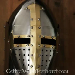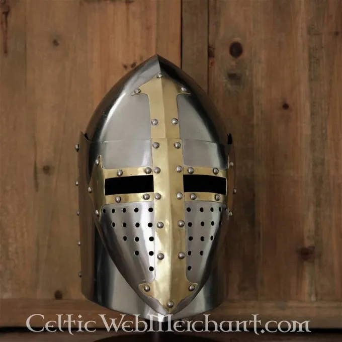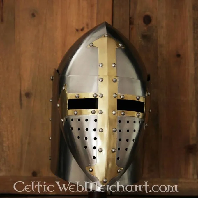 I middelalderen, hjelm med en konisk form blev kaldt Sugarloaf hjelme, fordi deres form lignede præcis det. De var hovedsagelig populær i det 14. århundrede. Denne hjelm skiller sig ud på grund af sin hængslede visir. Det er håndgjort af 1,6 mm tykt stål. Denne hjelm kan easilt justeres til den rigtige størrelse med sin linned speeches. Det har også en hagerem. Den er velegnet til en Hovedets omkreds op til 61 cm. Fra øre the øre det er 19 cm bred og foranstaltning fra nakken til panden måler 22,5 cm. Det vejer ca.. . 2,9 kg