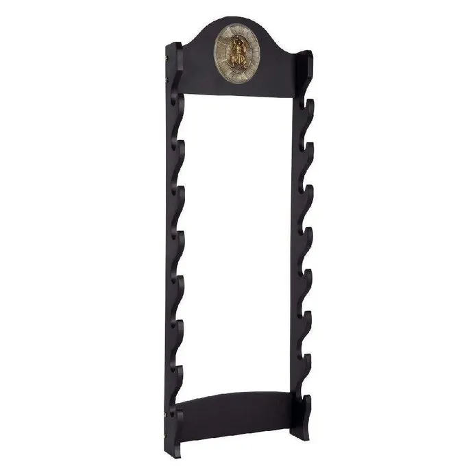 En stilfuld væg display til visning af otte katanas, iaitos, bokkens eller wakizashis. Denne væg display er lavet af sort syltede træ, er 34 cm bred og 100 cm lang.