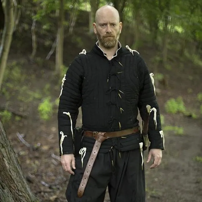Denne gambeson består af tre lag med fluffet bomuldsdug med blødt indersidet foder og et uldmixekloster, det kan bæres under re-enactment og LARP-kampe. Den har en hævet krave til ekstra beskyttelse i nakken. På forsiden kan du binde det med bomuldssnør. Denne acketon er meget komfortabel og giver fremragende bevægelsesfrihed.