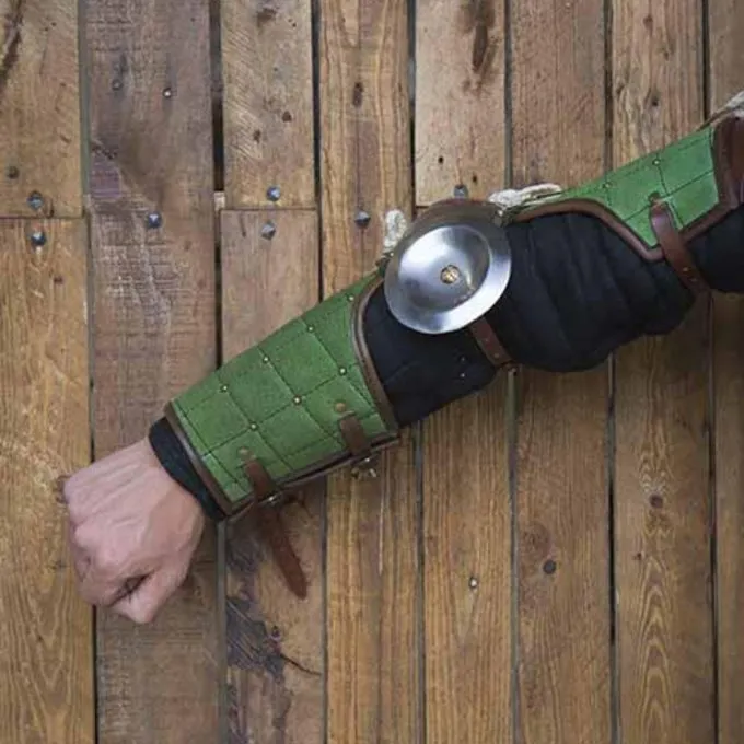 Disse armvagter er inspireret af originaler fra det 15. og det sekstende århundrede. De består af en stålbue med en rundbånd og læderbeskyttelsesarm til under- og overarm. Rustningen har et meget luksuriøst og stiligt look! Albue-polisen har en skalet stålkant dekoreret med farvet læder. Lædedelen af armbeskyttelsen er lavet af ruskindskind og har det luksuriøse udseende af fløjl, dette er også smukt dekoreret med messingnitter. Denne rustning kan kombineres perfekt med for eksempel en brigandine, dublet eller andre rustningstykker for at afslutte dit kostyme fra det 16. til det 16. århundrede. Rustningen består af tre overlappende dele, hvilket giver en optimal bevægelsesfrihed. Du kan fastgøre rustningen sikkert på din arm med læderbånd. Delene kan derfor også fjernes og bruges individuelt. Albuebægeren har snørebånd til at fastgøre den sikkert på læderarmbeskyttelsen, men du kan også kombinere dem med anden rustning efter eget valg.