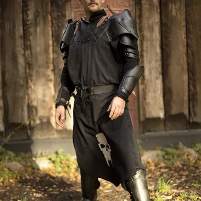 Materiale: blødt stål, læder, bomuld / / Levering omfatter: skulder rustning med Gorget, armbeskyttere i plade, grever, surcoat og bælte / / Stål tykkelse: 1 mm / / Finish: patinerede / / En størrelse passer alle /