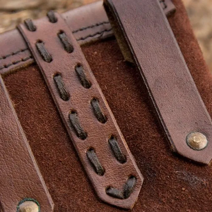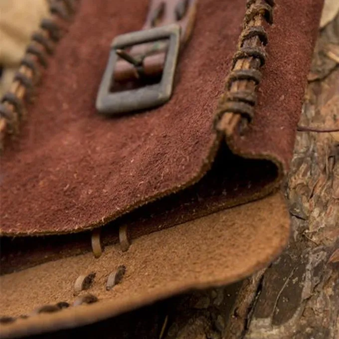 Denne pose har et smukt design og er velegnet til forskellige LARP og Cosplay tegn. For eksempel til pirater, snigmænd, handlende mv. Posen er lavet af blødt suede læder, og klappen og stroppen er fremstillet af robust læder. Den har håndstitchede detaljer, klappen og siden af posen syes med en tyk læderblonde. Posen har et autentisk udseende, der passer til mange tegn. Det har løkker på bagsiden, så du kan hænge det på dit bælte. Du kan lukke posen med messing spænde på forsiden.