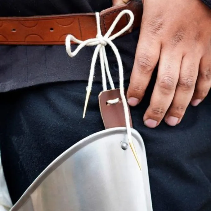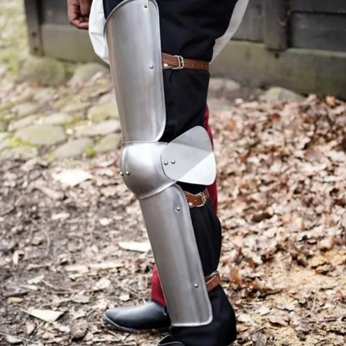 Denne benrustning er baseret på originaler fra det 15. århundrede. Originaler kan ses i for eksempel Royal Armories i Leeds og i italienske malerier fra det 15. århundrede. En lignende benpansel er for eksempel afbildet i Montefeltro altertavlen af Piero della Francesca, hvor de bæres af den knælende condottiere Federido da Montefeltro. Den malede benrustning var bare lidt mere luksuriøs. Denne replika benrustning beskytter overbenet, underbenet og knæene. Stærke læderremme bagpå rustningen gør det muligt at fastgøre det sikkert. Toppen har hvide snørebånd til fastgørelse til dit bælte, gambeson eller brystplade. Benpanser kan derfor bæres behageligt i timer og forbliver fastgjort. Bagsiden af knæet er godt beskyttet af de autentiske historiske runde. Denne rustning kan kombineres med andre rustningstykker og er perfekt til sene middelalderlige kostumer.