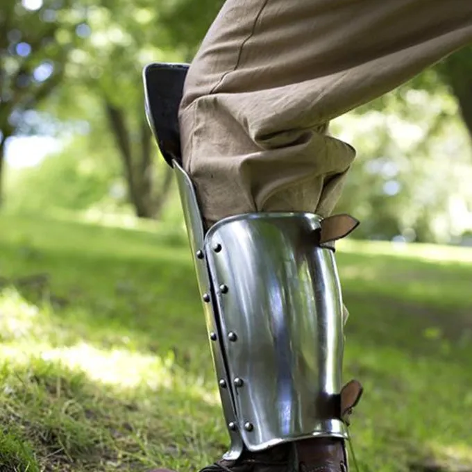 Denne ben rustning består af grever med integrerede poleyns. På den måde har du en rustning, der beskytter hele underben, og er også helt kompatibel og i samme visuelle stil. De poleyns er knyttet til de benskinner med læder, så de bøjer med benet. Den rustning er dekoreret med hævede kanter og stål nitter til en smuk historisk udseende. Du kan fastgøre ben rustning sikkert med forskellige læderremme, disse er også justerbar til din størrelse. Denne rustning er 1 mm tyk og er egnet til larp slag, kostumer og Cosplay.