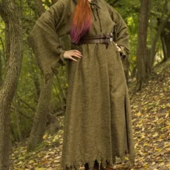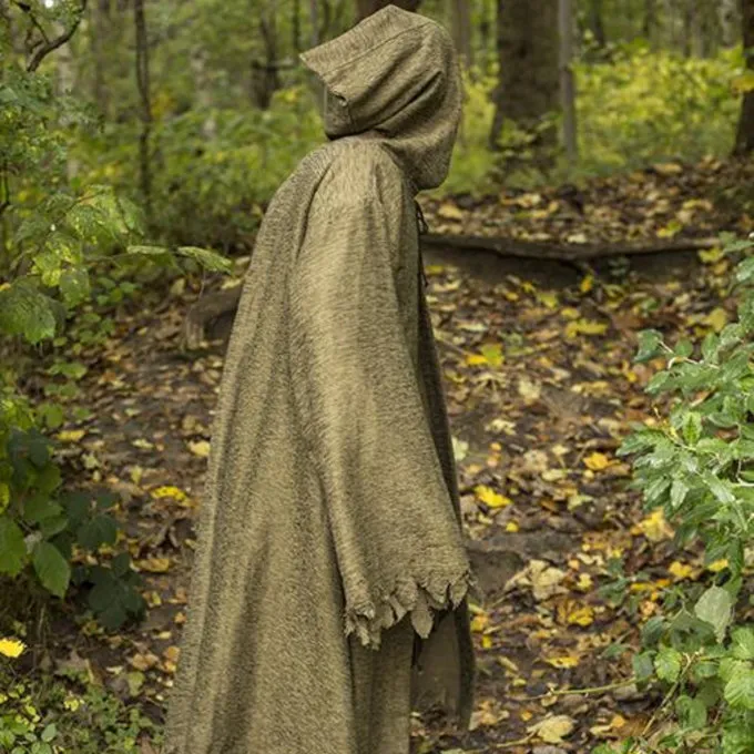 Traditionelt blev klæder båret i religiøse omgivelser, for eksempel af munke og præster. I traditionel fantasilitteratur er dette blevet tøjet til magiske karakterer. Denne kjortel er designet til at se slidt og flosset ud. Det er lavet af struktureret bomuld, der ligner et grovt jute-lignende stof og er flosset på alle kanter. Hvis du LARPing en orc, trold eller anden uhyrlig væsen eller udstødt, er dette et perfekt tøj til at bære over dit kostume. På grund af den ru finish og hætten, som du kan bære over hovedet, giver kappen dig et uhyggeligt og ondt look. Dette gør det også yderst velegnet til Halloween og teater. Kappen er velegnet til udendørs brug i alle sæsoner og beskytter mod regn og kulde. Du kan fastgøre kappen på halsen med en læderblonder og en læderstrimmel.