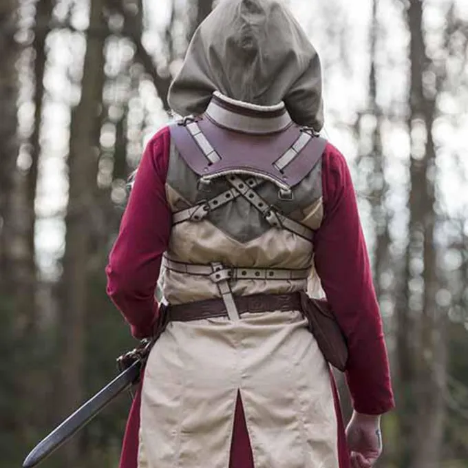 Denne smukke læderarmor af høj kvalitet beskytter brystet og halsen, mens du ser hård, farlig og elegant på samme tid. Brystdelen er netop formet til kvindens krop og fremhæver formerne. Takket være bomuldsstropperne, der løber over skuldrene og ryggen, kan rustningen justeres i størrelse. Designet viser en kontrast mellem læderoverfladen og lærredens bomuld.