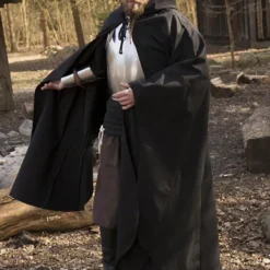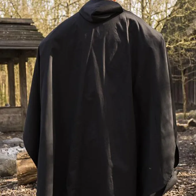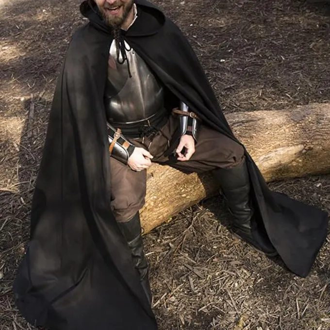 Denne kappe er lavet af bomuldskvold og beskytter dig mod regn, vind og sol, når du er ude hele dagen. Kappen giver en god mobilitet for armene, så du også kan bære den i slag. Med bomuldsblonder kan du fastgøre kappen omkring din hals. På bagsiden har den en hætte til beskyttelse af hovedet. Denne lange kappe falder på anklerne eller skoene, så du kan endda sove i den. Sådanne kappe blev slidt fra den tidlige middelalder til renæssancen, så den er velegnet til genoptagelse af flere historiske perioder og også til fantasi og LARP.