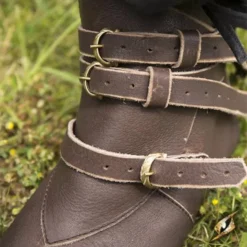 Disse middelalderlige ankelstøvler er baseret på originaler, der blev brugt over det middelalderlige Europa i løbet af det fjortende og femtende århundrede. Ankelstøvler gav ekstra støtte til fod og ankler, så det var en populær type fodtøj. Sko var meget dyre i middelalderen, og de varede i mange år. De blev repareret, afleveret af familiemedlemmer og kombineret med træpattens, som var beregnet til at beskytte skoene mod slitage. Pattens var også praktisk til at gå gennem de beskidte gader i byen. Disse ankel støvler har smukke historiske messing spænder. Du kan fastgøre skoene med tre læderremme, der kan justeres til din størrelse. Ankelstøvlerne er lavet af højkvalitetsfarvet brunbrunt læder. Sålen er lavet af gummi, så fodtøjet varer længere og forhindrer glide på glatte overflader som vådt græs. Gummi er også bedre egnet til moderne overflader som beton og asfalt end historiske lædersål. Disse ankelstøvler er en smuk og holdbar tilsætning til din middelalderlige reenactment eller LARP kostume.