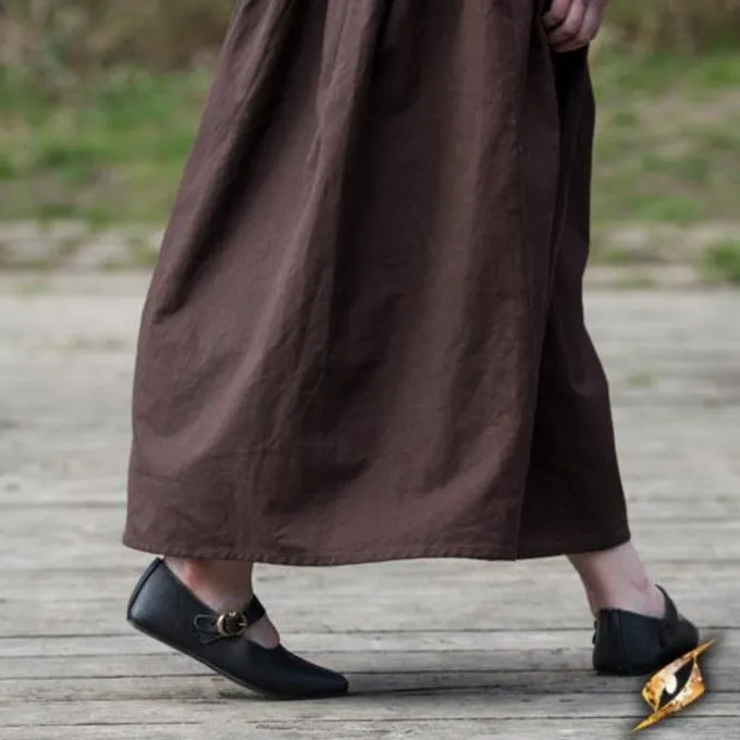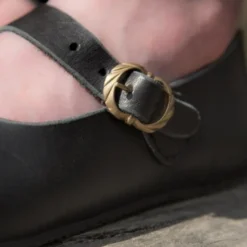 Lædersko som disse blev primært båret omkring i fjortende femtende århundrede af rigere kvinder og kvinder fra handlende, håndværkere mv. Skoene er lavet af højkvalitets vegetabilsk garvet læder og har en gummi ydersål, så du også kan gå på moderne overflader som f.eks. asfalt og brosten uden alvorlig skade på sålerne. Du kan fastgøre skoene med en læderrem, herunder et historisk messing spænde. Disse er behagelige sko til re-enactment og LARP af middelalderlige og renæssance tegn.