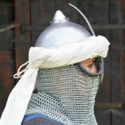 Denne hjelm er baseret på historisk asiatisk rustning og er fantastisk til LARP eller Cosplay af østlige historier som Aladdin. Hjelmen er fuldt funktionsdygtig og tilbyder fremragende hovedbeskyttelse i LARP-slag. Den lange næsehætte på fronten giver hjelmen et eksotisk udseende og giver samtidig et godt synsfelt og beskytter ansigtet. Næsebeskyttelsen kan også fjernes, hvis du vil bære hjelmen med en anden drejning. Hjelmen har en bred åbning for øjnene og en forhøjning bestående af buttede ringe. Kanterne på kædepostbegivenheden foran har en læderfor. Dette ser godt ud, men det sikrer også, at kædemail ikke ubehageligt gnider mod dit ansigt. Du kan fastgøre hjelmen sikkert med en læderrem under hagen. Hjelmen leveres inklusive en hvid turban, som du kan fastgøre til stålet ved hjælp af de fire huller bagpå hjelmen.