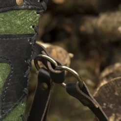 Materiale: vegetabilsk garvet læder, messing, ruskind læder; / Farve: sort-grøn; / Længde: 70 cm; Diameter: 8 cm (nederst) og 12 cm (top); / Bredde: 20 cm; / Længde bælter: 120 cm; / Bæltebredde: 1,8 cm;