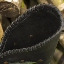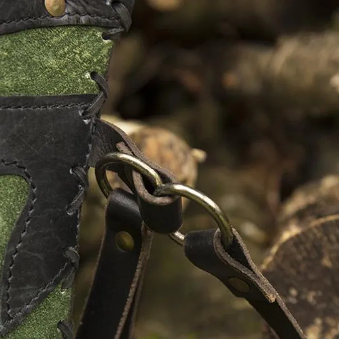 Denne kvæler er lavet af ruskind læder og har smukke dekorative mønstre i stærkt vegetabilsk garvet læder i bunden og toppen. Quiveren er foret med en håndsyet læderblonde. Den har to stropper, med en rem kan du bære pilskiven på ryggen og med den anden rem kan du fastgøre den rundt om din hofte til et bælte eller en baldrisk. På denne måde forbliver det på plads under et intensivt slag.