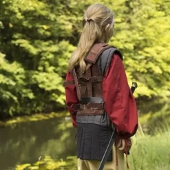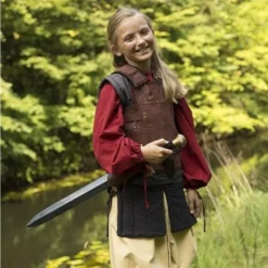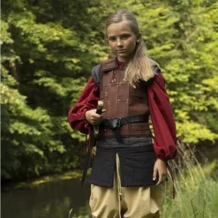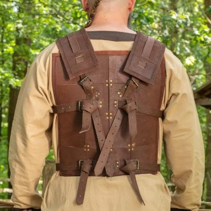 En grundlæggende læder rustning eller kropsbeskyttelse, lavet af stærk brunt læder med mange messing-farvede nitter. Egnet til larp og nyopførelse. På bagsiden og siderne, den rustning har stropper så den kan justeres til den rigtige størrelse. Det fås i størrelserne S, M, L og XL.