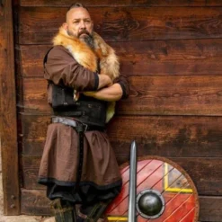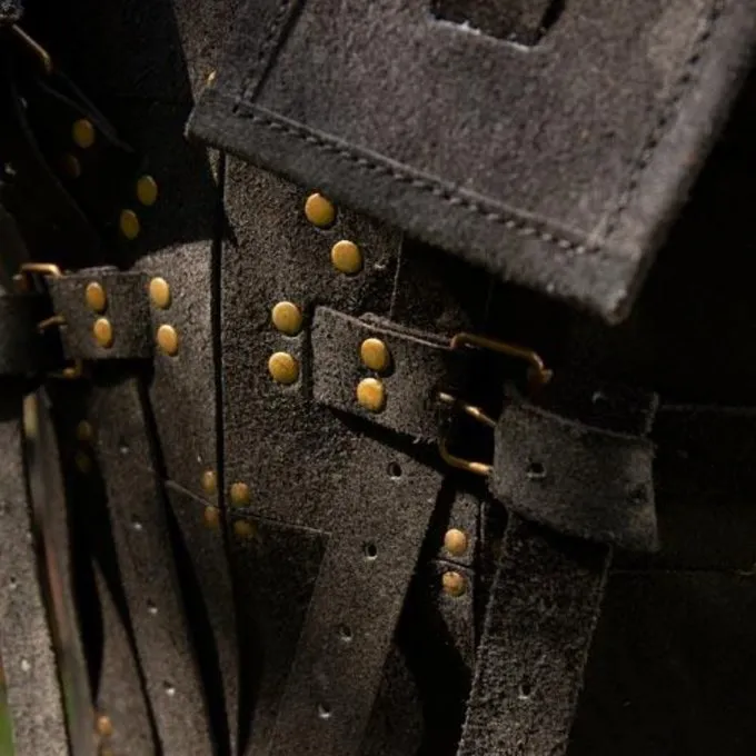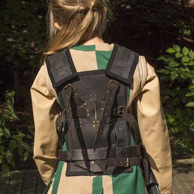Denne læder rustning med forkromede messing negle er velegnet til både voksne og børn. Den fås i fire størrelser, men stropperne på bagsiden gør den meget justerbar inden for disse størrelser. En smuk læder rustning til en venlig pris. Velegnet til LARP & Cosplay af forskellige karakterer som vikinger, saksere, kelter og serier som Last Kingdom, vikinger osv.