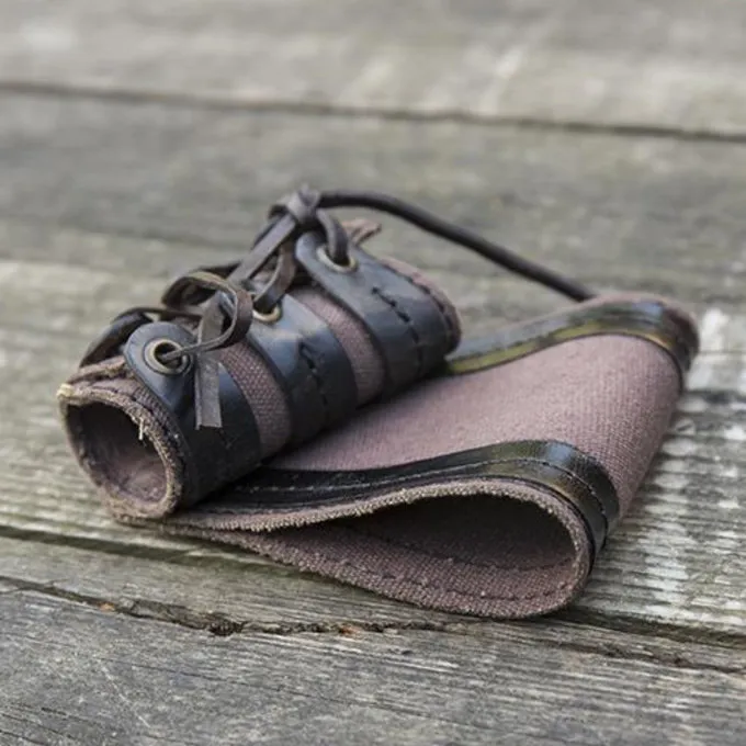 Detaljer / Materiale: lærred, læder, messing / Farve: brun-sort / Holderlængde: 8 cm / Max diameter LARP våben: 5 cm / Max båndbredde: 5,5 cm / Vægt: 150 g / Fragtvægt: 200 gram