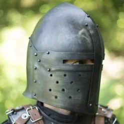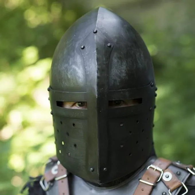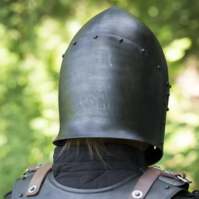Denne middelalderlige hjelm (Sugar Loaf Helmet) er baseret på originaler, der blev brugt mellem 1300 og 1390. De originale hjelme havde en bevægelig visir, men denne replika er desværre en lukket hjelm. Hjelmen beskytter hele hovedet og ansigtet. Det har ventilationshuller og en bomuldsindsats, så du kan fortsætte med at trække vejret optimalt, og sved absorberes af bomulden. Du kan fastgøre hjelmen under din hage med en læderbeslag. Den specielle patinerede effekt giver din custome et ekstra autentisk udseende. Denne hjelm er 1 mm tyk og passer til LARP-kampe, kostumer og Cosplay.