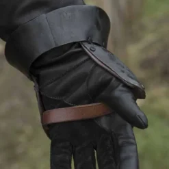 Materiale: kulstofstål (1 mm), læder / / Finish: patinerede / / Levering: pair / / Længde: 14 cm / / Hånd bredde: 9 cm / / Håndled bredde: 8 cm / / Baseret på en historisk original