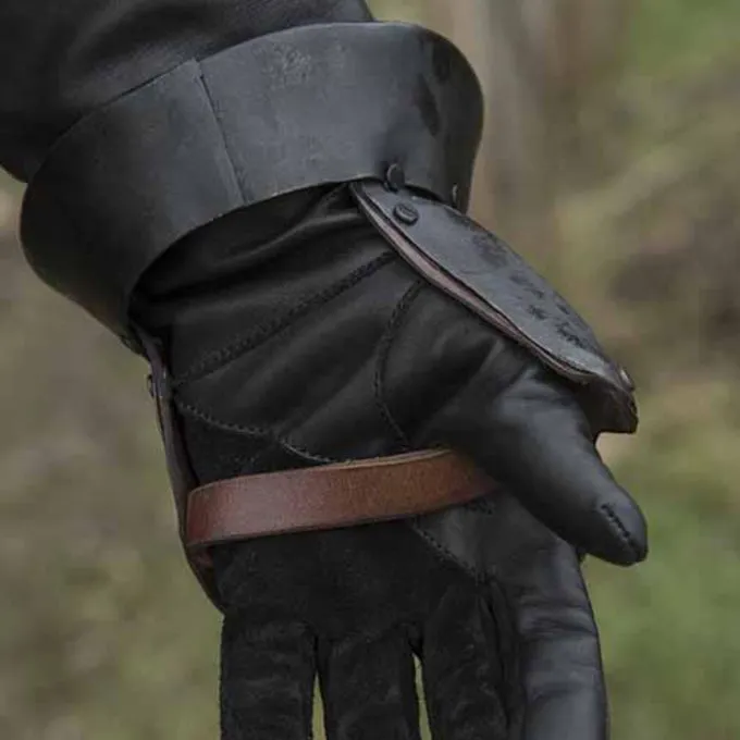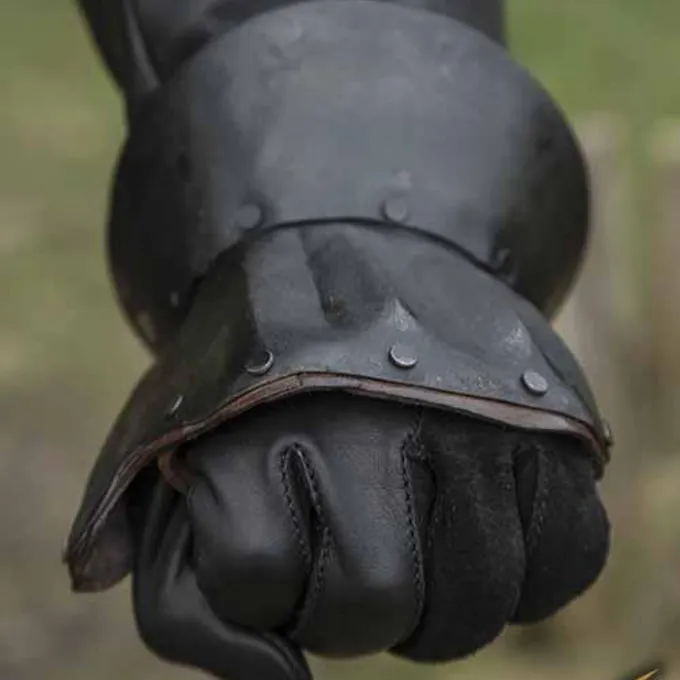 Disse timeglas halve gauntlets er baseret på historiske originaler fra det sydlige Tyskland foretaget i det fjortende århundrede. I den sene middelalder, blev disse typer af halve gauntlets slidt over hele Europa. Disse gauntlets beskytte håndled og bagsiden af hånden mod slag fra våben og skjolde. Du kan kombinere disse gauntlets med læder handsker til ekstra beskyttelse. Komfortabel historiske handsker til en venlig pris, og kompatible med nogen rustning. Den patineret finish giver et ekstra speciel effekt. Disse gauntlets er 1 mm tyk og er egnet til larp slag, kostumer og Cosplay.