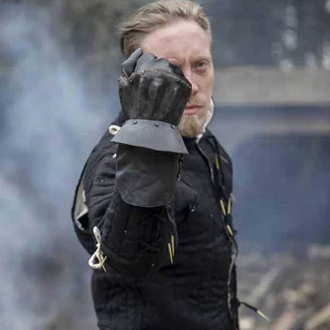 Du fastgør din rustning eller ringbrynje ved at fastgøre læderbånd til din slagkofte og binde disse fast på din rustning/ringbrynje. På den måde sikrer du, at rustningen forbliver på plads under kampen.