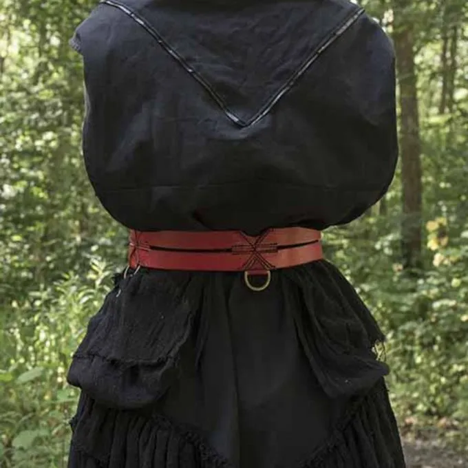 Denne praktiske læderbælte er lavet af en høj kvalitet vegetabilsk garvet læder. Båndet består af to enkelte bælter, der er forbundet ved fire X-formet læder indsætter. Bæltet har fire messing ringe, der er utroligt nyttigt til at hænge udstyr, såsom en pose, larp knive, mad og lignende. Du kan binde tingene sammen og knytte dem til de ringe med remme og reb. På denne måde kan du tilpasse remmen til din egen LARP, Cosplay eller fantasi kostume. Båndet er multifunktionel og egnet til alle larp karakterer. Ser flot over en tunika, men kan også kombineres med kjoler eller til at bære over en kappe.