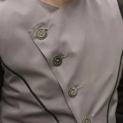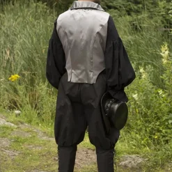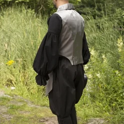 Denne smukke asymmetriske vest er perfekt til genindførelse af det nittende århundrede, LARP og steampunk. Det er lavet i victoriansk stil og let at kombinere med en skjorte eller kjole for at give dit outfit ekstra lokkelse. Den øverste har en række med fire knapper. Du kan vælge at lukke alle knapper eller åbne kraven. Kraven har en grå satinfor, så når den åbnes, vises den grå farve. Bagsiden har også et gråt satinfor. Denne vest understreger taljen og løber til knæene. Fronten er længere end bagsiden, hvilket giver en fascinerende og smuk asymmetrisk effekt.