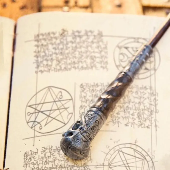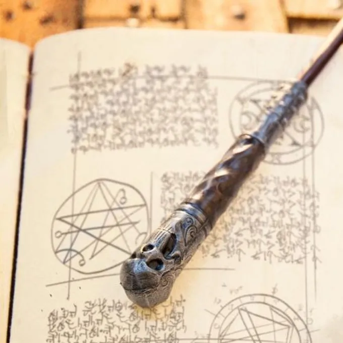 Denne stav er naturtro designet og malet i hånden, således at grebet synes at være lavet af træ med en sølv kranium og sølv bands. En perfekt wand til necromancers og onde troldmænd. Den tryllestav er lavet af træ og har en polyurethanskum greb. Du kan adskille grebet fra staven og sætte det på andre Epic Armory tryllestave, for en bedre tilpasning og udskiftning af knækkede spidser. Denne tryllestav krævede lidt vedligeholdelse og er perfekt til LARP eller Cosplay af Harry Potter, Fantastic Beasts og andre magiske verdener.