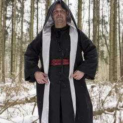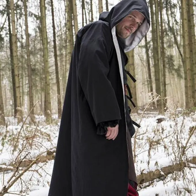 Denne robe er perfekt til LARP og Cosplay magiske tegn. Den robe har lange vide ærmer og en stor hætte. Indersiden af hætten og den indvendige foring er kantet med sølvfarvet satin.