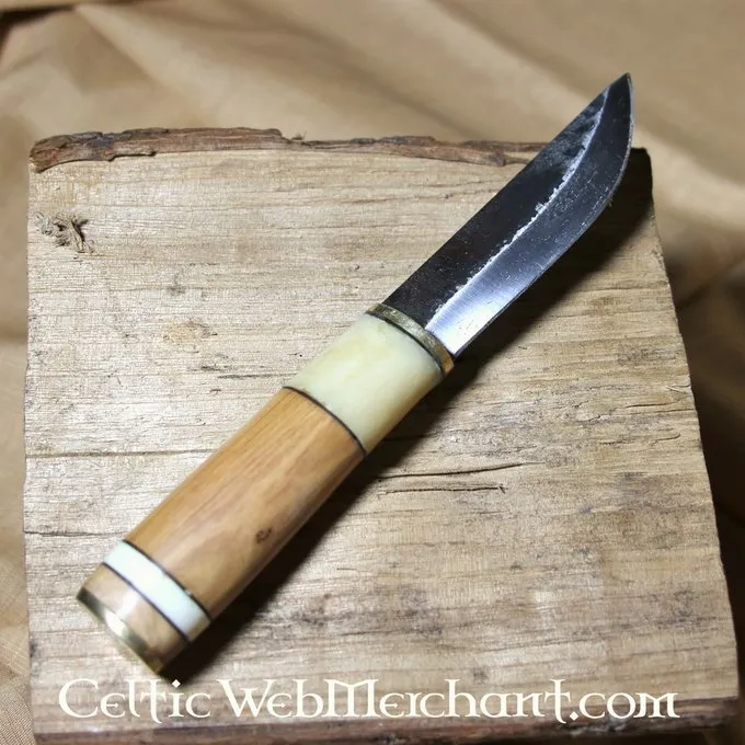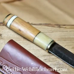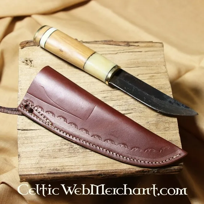 Knive som dette blev brugt i de tidlige middelalder, for eksempel af Merovingianerne, Angelsaxerne og vikingerne. En praktisk hjælpekniv var uundværlig for hverdagens job. Denne kniv har et håndskåret blad og et greb af knogler, træ og messing dekorationer. Den leveres med en brun læderkappe med dekorativt mønster. Alt i alt er dette en kniv med smukke detaljer og et aktiv til enhver viking, germansk, angelsax eller frank.