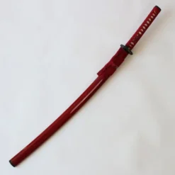 En katana med en smuk rød højglans lak skede. Den grebets omvikling er også rød. Vagten (Tsuba) skildrer scener fra de traditionelle japanske na ‘h teatre, som i dag stadig populære, selv om de allerede opstod i det 13. århundrede.