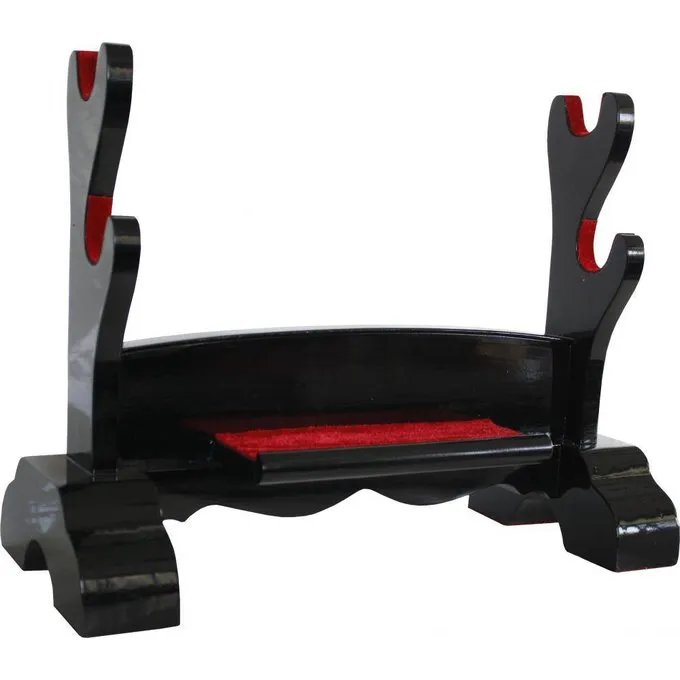 Denne luksuriøse katana stativ er velegnet til tre samurai sværd, Tantos eller wakizashis. Stativet er lavet af sort syltede træ og er indlæged med blødt rødt stof. Denne luksuriøse stativ er 41 cm bred og 31 cm lang.